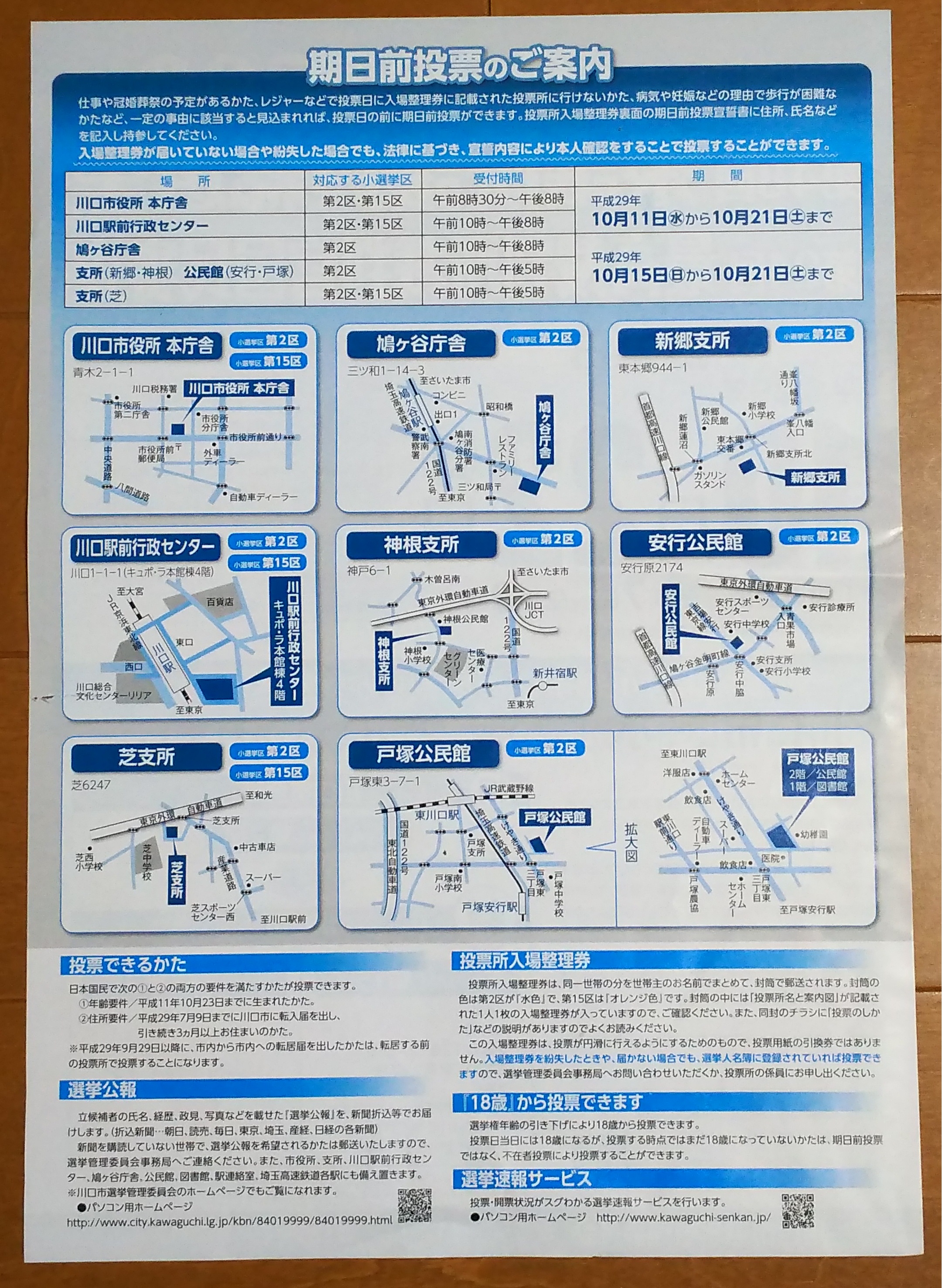 投票日に投票所に行けない場合とかで、もう少し前に投票を済ませたいっていう場合は、 投票日より前に投票するっていうこともできる。 それについては、投票所入場整理券と一緒に送られてくる紙とかに書いてあるかな。新聞の折り込みチラシとかでその案内がある場合もあるかも。