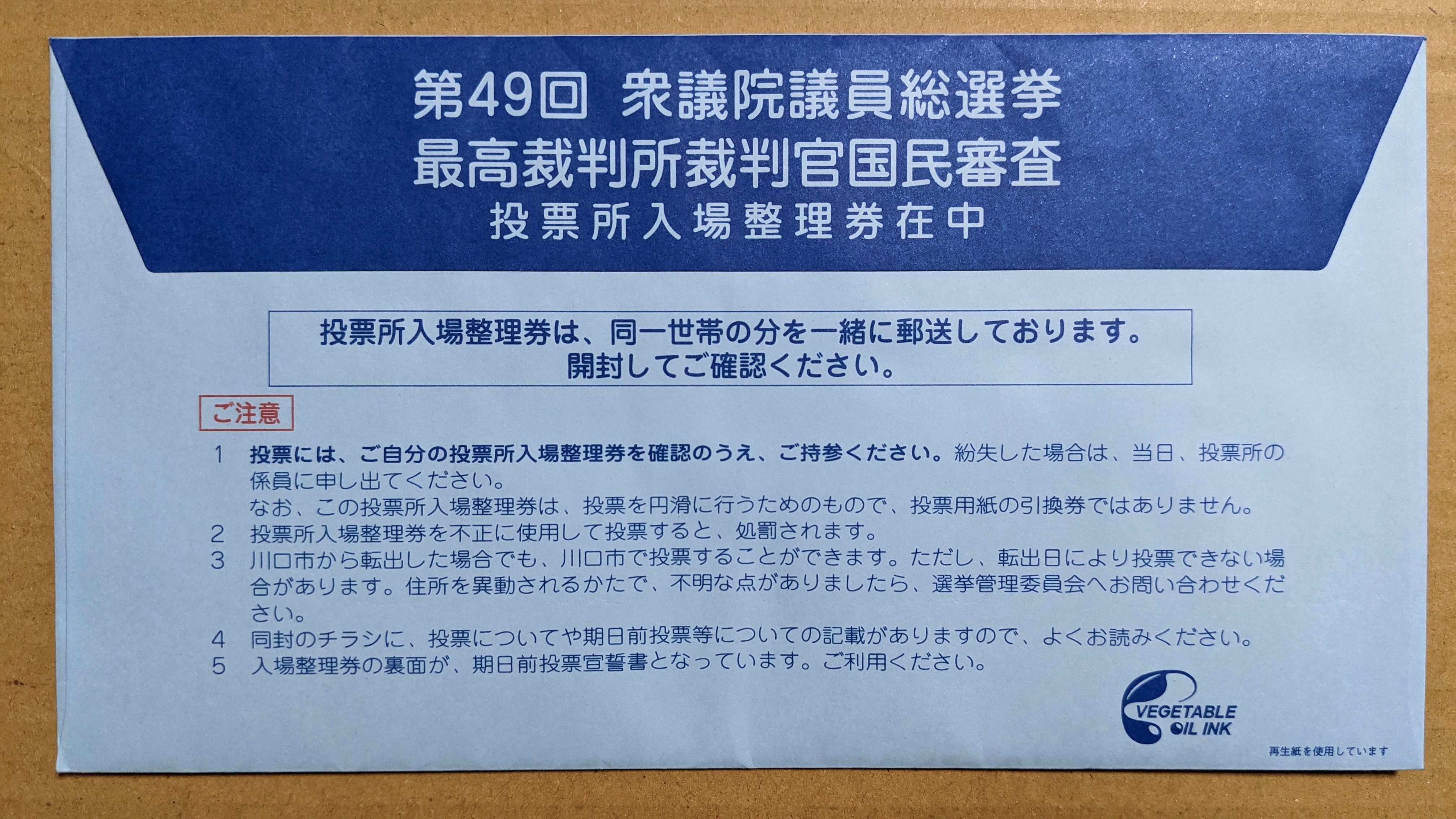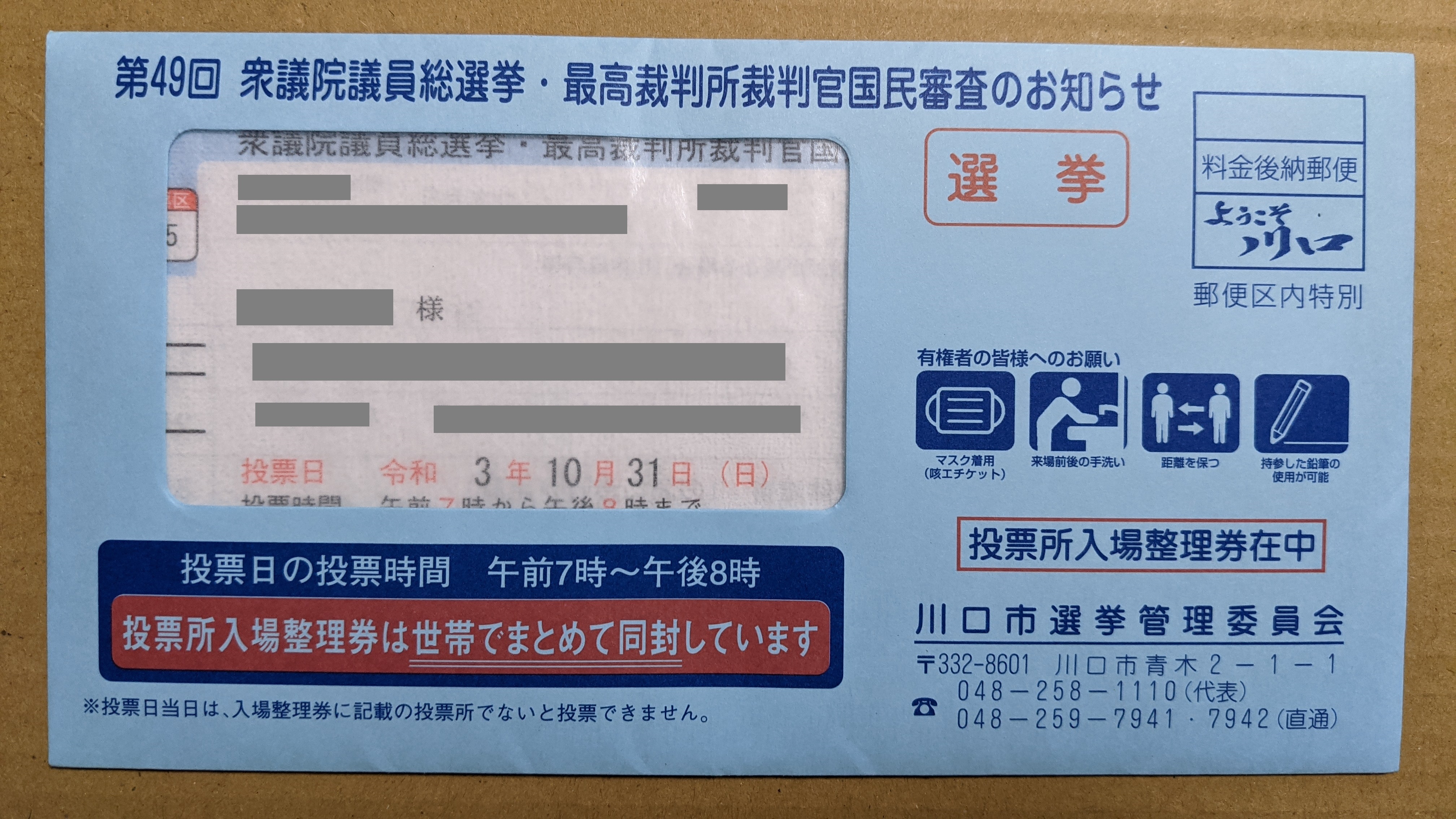 まあ、地域によっては、封筒じゃなくて、はがきで送られてくるところもあるらしいかな。「投票所入場整理券」っていう呼び名とはちょっと違う呼び名のところもあるかも。