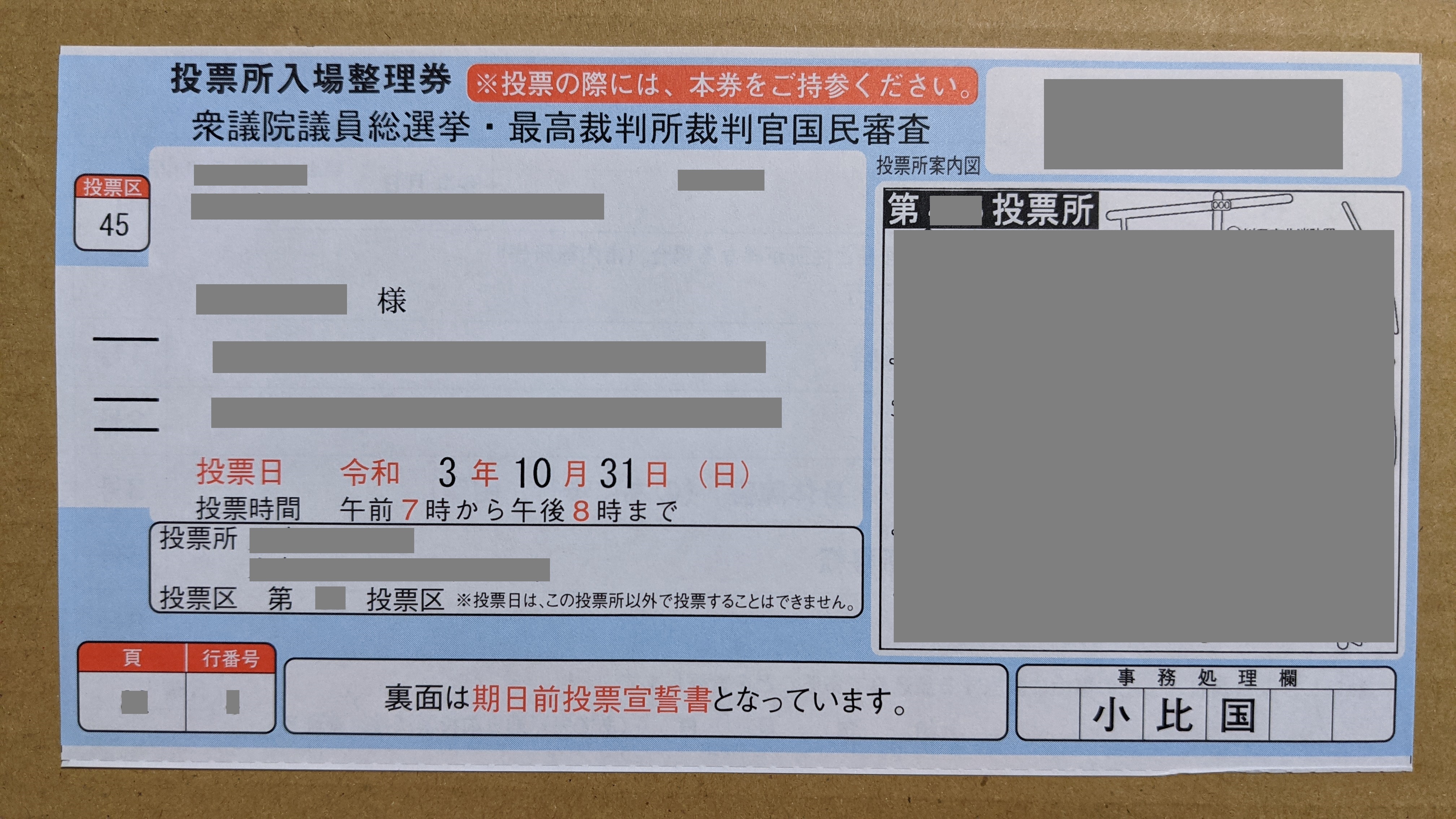- 受付で、投票所入場整理券を渡す。「○○さんですね」と名前の確認をされる。